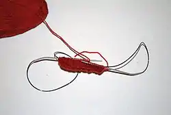 Invented by Sarah Hauschka and first described in Beverly Galeskas’s booklet The Magic Loop, this technique uses a long circular needle (for instance 40 inches) to knit projects (of any circumference substantially less than the needle length) in the round. The key is pulling a loop of extra cable out between the stitches halfway through the round.[6]