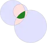 A circular horn triangle is a similar concept, but represents the area interior to 3 mutually tangent circles so all of the internal angles are zero.[1] The arbelos is a special case with three collinear vertices and three semicircular edges.[2]