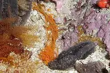 Orange thread-gilled worms grow to up to 10 cm in total length. They are soft bodied worms which lie buried in sand or mud or between mussels. Only the long tangled orange gills and soft food gathering tentacles are visible.[2]