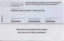 Since the conclusion of the Equality Statute between Brazil and Portugal (Estatuto da Igualdade entre Brasil e Portugal) between the two nations at Porto Seguro on 21 April 2001, Portuguese and Brazilian citizens are considered to have identical rights and privileges across both countries. Accordingly, a Brazilian national may apply for and be issued Citizen Card in the same style as would be issued to a Portuguese national, except that the "Nacionalidade" (nationality) field shows "BRA" to indicate the bearer's Brazilian citizenship, and the back of the card carries the supplementary remark "CIDADÃO BRASILEIRO AO ABRIGO DO TRATADO DE PORTO SEGURO - BRAZILIAN CITIZEN UNDER PORTO SEGURO AGREEMENT".