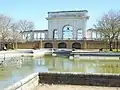 The arch is flanked to either side by curved stone colonnades of three bays, about 6 m (20 ft) high and 26 m (85 ft) long, with a frieze, cornice and low parapet, with wrought iron railings between the stone columns. The walls on either side extend the overall length to over 70 m (230 ft). As originally built, steps aligned with the central arch led down to the west bank of the River Trent, but the steps were moved after the Second World War. The central arch is still aligned with an ornamental pond in the memorial gardens to the west.