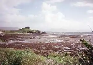 The Macdonalds of Sleat descend from Domhnall's son, Aonghas Mór; and then from his son, Aonghas Óg. Angus Óg's son, Eoin, was the first Lord of the Isles. Eoin I's first marriage was to Áine, heiress of Clann Ruaidhrí (which was founded by Ruaidhrí, elder brother to Domhnall, founder of Clan Donald).[15] Eoin I later divorced Áine and married Margaret, daughter of Robert II. The children from Eoin I's first marriage were then passed over in the main succession of the chiefship of Clan Donald and later Macdonald lords of the isles, in favour of those from his second marriage.[16] Eoin I was succeeded by his son, Domhnall of Islay; who was in turn succeeded by his son, Alasdair of Islay. The Macdonalds of Sleat descend from Ùisdean, bastard son of Alasdair of Islay and the daughter of Ó Beólláin (O'Beolan), Abbot of Applecross. From Ùisdean, the Macdonalds of Sleat are also known in Gaelic as Clann Ùisdein ("the children of Ùisdein").[17]