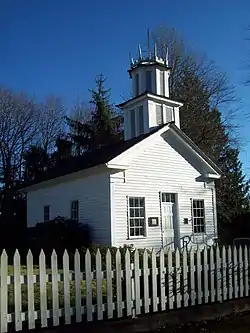 The 1953 renovation, overseen by a local American Legion chapter, made no changes to the building but did include restoring the original woodwork, repairing the belfry, hanging new mid-19th century style wallpaper, and refinishing the exterior.[8] In 2006, the crown of thorns on the steeple was restored and the Lewis County Historical Society installed a commemorative plaque, a "Meeker marker", in honor of early non-Native pioneer, Ezra Meeker.[9]
