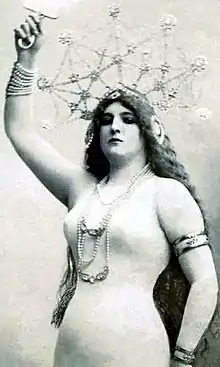 Her main talents were being beautiful by the standards of the time, and being famous. She combined the two by posing on various stages, including at least the Folies Bergère and probably also the Moulin Rouge, while wearing skin-tight costumes. She called her art-form her poses plastiques. Henri de Toulouse-Lautrec made a scarce lithograph of her and Rigó in 1897, "Idylle Princière". She was often photographed, and featured on many postcards during the Edwardian period, sometimes in a pose plastique and sometimes in more or less conventional dress. Kaiser Wilhelm II is said to have forbidden the publication or display of her photograph in the German Empire because he thought her beauty "disturbing".
