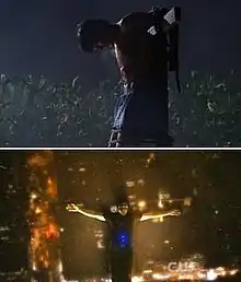 A significant moment in the character's story came when Clark decided to play football in season four, providing conflict between him and his father. Writer Darren Swimmer refers to this moment as a "... callback to [Hothead] ..." in season one. To him, when Clark defies Jonathan and joins the team anyway, it signified the moment where Jonathan finally decided that he can trust Clark to not hurt anyone. Writer Todd Slavkin viewed it as Clark finally emerging from his father's shadow.[57] Two more significant moments came during the following season. First, Clark lost his powers when he failed to return to Jor-El to finish his training; leaving him human and vulnerable. According to Welling, "... [Clark] learned a little bit more about what it's like to be human, physically. Emotionally, he's pretty close to trying to understand that. It added more weight to his abilities once he got them back, and it made him realize his responsibilities for what he has."[56] The second moment came in the show's 100th episode, with the death of Clark's adoptive father. The decision to kill Jonathan was made so that Clark could finally step into his destiny, allowing Clark the boy to become Clark the man, as explained by Gough. In order to do that he needed his mentor to die, so that no one would buffer him from the world any longer.[62] Welling saw the series' 100th episode as the chance for his character to evolve and grow.[56] John Schneider saw the same catalyst for Clark's evolution. According to Schneider, Jonathan's death inspired Clark to make the move toward his eventual destiny. Jonathan provided such an example of sacrifice that it leaves a void in Clark. To fill that void Clark would have to become Superman. It was Schneider's contention that had Jonathan not been the man he was, when the time came that the world needed Superman, Clark would have been unable to take on that persona, because he would not realize that the world needed him.[63]