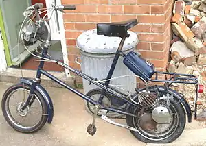 It combined a proprietary 1960s small-wheel cycle-type frame (obtained from the Co-operative Wholesale Society which sold the bicycle as the Commuter) with modifications to mount an innovative 50cc two-stroke engine close to (and outboard of) the rear wheel.