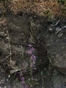 Clarkia mosquinii is a rare species of flowering plant in the evening primrose family known by the common name Mosquin's clarkia. It is endemic to California, where it is known only from the northern Sierra Nevada foothills at the border between Butte and Plumas Counties. It was thought to be extinct until it was rediscovered in 1991.[1] It is an erect annual herb often exceeding half a meter in height. The oval or lance-shaped leaves are 2 to 5 centimeters long. The inflorescence bears opening flowers below a series of clusters of closed, hanging flower buds. The sepals all separate as the flower blooms. The diamond-shaped petals are one to two centimeters long light to medium purple in color, and sometimes speckled with reddish purple.