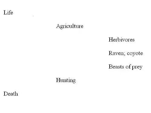 Lévi-Strauss argues that the raven and coyote "mediate" the opposition between life and death. The relationship between agriculture and hunting is analogous to the opposition between life and death: agriculture is solely concerned with producing life (at least up until harvest time); hunting is concerned with producing death. Furthermore, the relationship between herbivores and beasts of prey is analogous to the relationship between agriculture and hunting: like agriculture, herbivores are concerned with plants; like hunting, beasts of prey are concerned with catching meat. Lévi-Strauss points out that the raven and coyote eat carrion and are therefore halfway between herbivores and beasts of prey: like beasts of prey, they eat meat; like herbivores, they don't catch their food. Thus, he argues, "we have a mediating structure of the following type":[32]: 224
