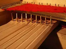 In the clavichord, strings run transversely from the hitchpin rail at the left-hand end to tuning pegs on the right. Towards the right end they pass over a curved wooden bridge. The action is simple, with the keys being levers with a small brass tangent, a small piece of metal similar in shape and size to the head of a flat-bladed screwdriver, at the far end. The strings, which are usually of brass, or else a combination of brass and iron, are usually arranged in pairs, like a lute or mandolin. When the key is pressed, the tangent strikes the strings above, causing them to sound in a similar fashion to the hammering technique on a guitar. Unlike in a piano action, the tangent does not rebound from the string; rather, it stays in contact with the string as long as the key is held, acting as both the nut and as the initiator of sound. The volume of the note can be changed by striking harder or softer, and the pitch can also be affected by varying the force of the tangent against the string (known as Bebung). When the key is released, the tangent loses contact with the string and the vibration of the string is silenced by strips of damping cloth.