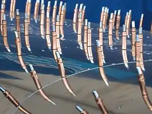 The basic type consists of a steel cylinder body, a plunger on the top, a spring, a pair of step-cut locks, and a spreader bar. A special type of pliers are used to push in the spring-loaded plunger. This pushes down on the step-cut locks, which pushes them away from the spreader bars and allows them to come together. This allows the user to slip the locking jaws through a hole made through multiple sheets of material. When the plunger is released the spring pulls the locking jaws back towards the spreader bar, which separates the two jaws. The material sheets are then squeezed in between the step-cut area and the steel cylinder. This keeps the holes in the separate sheets aligned.[3]
