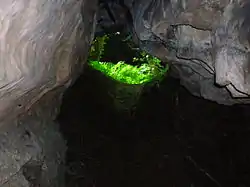 The word cove in Scots means 'cave'.[4] John Smith published a monograph entitled Cleaves Cove Stalactites and Stalagmites, published by Mr. Elliot Stock in which he provided drawings and a detailed description of these structures within the cave system,[5] many of which have been destroyed. The site was previously known as the 'Elfhouse' or 'Elfhame'[6] the locals at that time believed that these magical creatures had made this their abode.[7] Ness[8] calls the site Glen O'Dusk or the Elf-hame, the caves being the Elf-house.[9]