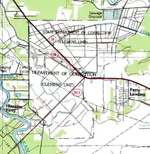 Clemens Unit (CN) is a prison farm of the Texas Department of Criminal Justice (TDCJ) in unincorporated Brazoria County, Texas in Greater Houston. The prison, with about 8,008 acres (3,241 ha), is located at the intersection of Farm to Market Road 2004 and Texas State Highway 36.[1] The prison, in the Texas Gulf Coast region,[2] is in proximity to the City of Brazoria,[3] and it is in proximity to the Velasco community, now a part of Freeport.[4] The prison is situated south of Houston.[2]