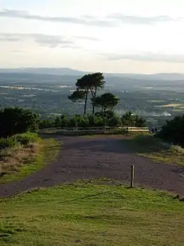 The Clent Hills lie 10 miles (16 km) south-west of Birmingham city centre in Clent, Worcestershire, England. The closest towns are Stourbridge and Halesowen, both in the West Midlands conurbation (and also historically in Worcestershire). The Clent Hills range consists of, in order from north-west to south-east: Wychbury Hill, Clent Hill (and Adams Hill), and Walton Hill (and Calcot Hill).[2] The north Worcestershire range of hills continues eastwards to include Romsley Hill, Waseley Hills and the Lickey Hills.[3][4]