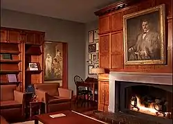 ![]() Photo of Cliff Dwellers fireplace and lounge area with portrait of Hamlin Garland, first president of the Club. | |