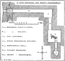 The tomb has a simple layout, consisting of a entrance stair leading to a descending passageway 17 metres (56 ft) long which opens to the right into a square antechamber. A further steeper corridor leads from the antechamber to another square room, the sepulchral hall. In the centre of the floor of this hall is cut a steep passage which leads to an unfinished room, presumably intended to be the burial chamber.[1]