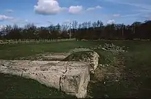 Most of the following are scheduled monuments. The Georgian foundations of the original Cliffe Hall, and the remains of a vicus, lie separately under ground nearby.[23][24][25] Medieval noblemen are said to have escaped persecution by going through the mythical Hell Hole tunnel in the cliff to Cliffe Hall.[26] An artefact said to be a market cross is still visible in the fields alongside the mounds where the buildings of the vicus were.[27] However this may be identical with the medieval Cliffe Park wayside cross which is dated 1066 to 1539 and described as follows: "Remains consist of the upper part of the shaft with head and arms set into a modern socket stone. The remains do not appear to be in situ and no indication of its original location".[4][28] Also of archaeological interest is the tumulus known as Betty Watson's Hill.[29] The Piercebridge conservation area does not cover Cliffe due to county boundary limitations.[30] Cliffe forms part of the site of Piercebridge Battle, the "1642 Civil War skirmish between the Earl of Newcastle (Royalist) on the march to York, and Captain Hatham. Both sides had canon, and the Royalists who had canon on Carlbury Hill won the day. Hatham retreated to Tadcaster while the Royalists marched to York".[4][31][32] There is a linear feature, from near Namen's Leazes to near Crow Wood, which goes through Aldbrough, Stanwick St John and Cliffe; it could be an earthwork bank, a defence dyke or a trackway.[4][33] At Cliffe Park there is a double bank earthwork, probably a park pale; and between the banks a small, well-made cobbled track was identified.[4][34]