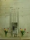 During baptisms the Pashcal Candle stands near the font (at other time it is on the Sanctuary).[4] The paschal candle stand is formed from segments of triangular stainless steel, and was designed by Ronald Weeks.[4] In the wall adjacent to the Baptistery there are three Holy Oil Tabernacles [F on Plan], for the retention of the Holy Oils used in the Sacraments of the Church (The Oil of Catechumens, Oil of Chrism & Oil of the Sick).
