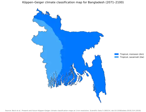 Climate change in Bangladesh is a critical issue as the country is one of the most vulnerable to the effects of climate change.[1][2] In the 2020 edition of Germanwatch's Climate Risk Index, it ranked seventh in the list of countries most affected by climate calamities during the period 1999–2018.[3] Bangladesh's vulnerability to climate change impacts is due to a combination of geographical factors, such as its flat, low-lying, and delta-exposed topography,[4] and socio-economic factors, including its high population density, levels of poverty, and dependence on agriculture.[5]