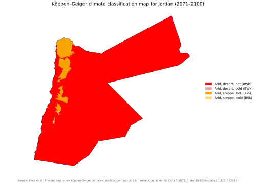 Another study comes to similar results. Using data from the last 30–83 years from six meteorological stations[3] in Jordan, the minimum temperature increased while the maximum temperature did not change significantly. Concerning total annual precipitation however, no visible changing trends are visible.[4]