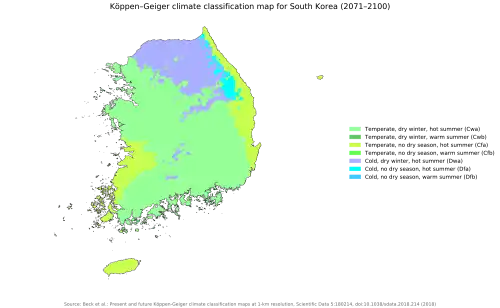 South Korea is experiencing a rapid temperature increase. Higher daily maximum and minimum temperatures are very likely to increase in East Asia, resulting in more severe warm extremes, but less severe cold extremes.[13] These mean temperature increases, especially the temperature increase rate after the 1950s is 1.5 times higher than before the 1950s. The duration of winter is also projected to be a one-month shorter than before, therefore having spring and summer will be 20 days longer during the 1990s compared to what they were during the 1920s seasonal distribution.[17] When average temperature comparison for comparing 20th-century and 21st-century temperature averages, it is shown that there is a 4 °C increase. The mean yearly temperature for South Korea is 10~15 °C,[18] which means that the Korea Peninsula will soon become a subtropical region with an average temperature of over 27 °C. The recent subtropical zone is located on the lower seaside of the Korea Peninsula, but as accelerated temperatures increase, it will result in the subtropical zone move migrating northward. Therefore, by 2100 the subtropical zone is projected to expand its region to the north end of Taebaek Mountains.[17]