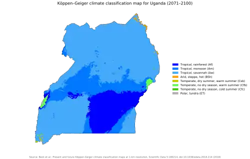 Climate change in Uganda is increasingly affecting the lives of Uganda's citizens and the environment at large.[1] Climate in Uganda has led to extreme weather events like prolonged drought and rainfall that are unusual, not common, irregular and unpredictable.[1] Uganda has mostly a tropical climate with regular rainfall and sunshine patterns. However, due to climate change the seasons have changed, with the rainy season becoming more variable in length and worse droughts, especially in eastern and northeastern Uganda.[2]