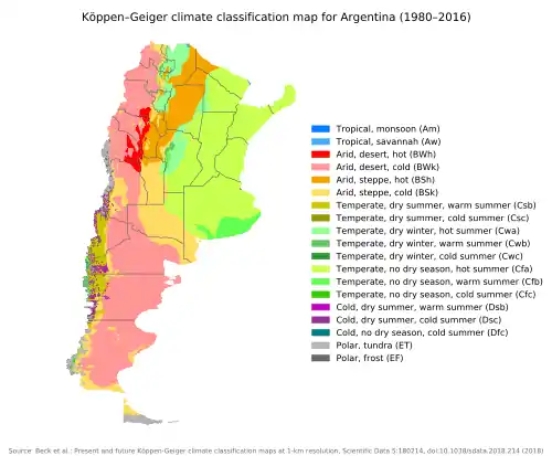Northwest Argentina consists of the provinces of Catamarca, Jujuy, La Rioja, and western parts of Salta Province, and Tucumán Province.[7] Although Santiago del Estero Province is part of northwest Argentina, much of the province lies in the Chaco region.[67] Northwest Argentina is predominantly dry, hot, and subtropical.[73] Owing to its rugged and varied topography, the region is climatically diverse, depending on the altitude, temperature and distribution of precipitation.[74] Consequently, the vegetation will also differ.[75] Under the Köppen climate classification, the region has five different climate types: semi–arid (BS), arid (BW), temperate without a dry season and temperate with a dry season (Cf and CW respectively), and, at the highest altitudes, an alpine.[75]