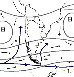 Prevailing winds, sea currents and stationary cyclones near Chile