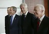 The Clinton Presidential Center was dedicated on November 18, 2004. Although it was raining, the ceremony was attended by approximately 30,000 people (including notable figures such as Willie Mays, Robin Williams, and Barbra Streisand) and included a 20-minute speech made by Clinton, who had recently undergone bypass surgery.[17] It also included performances by Bono, the African Drum Ballet and the Philander Smith Collegiate Choir, as well as an invocation given by Floyd Flake and video tribute from Nelson Mandela. Four U.S. presidents (Clinton, Jimmy Carter, George H. W. Bush, and George W. Bush were present; former president Gerald R. Ford could not attend due to health concerns) were on the same stage together.[18] All three other presidents spoke at the event as well.[10][19] Overall, the ceremony lasted two hours and featured six speakers.[11]