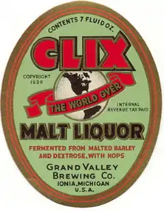 Clix is a brand of malt liquor made by the Grand Valley Brewing Company in 1937. It is often credited as the first malt liquor brewed in the United States.[1] At Gluek Brewing in Minneapolis, Minnesota, Alvin Gluek had a similar idea in 1942. The style is light in body, thin and sweetish in taste, and high in alcohol.[2]