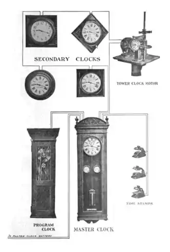 Diagram of electric time system used around 1910 to keep time in factories, schools, and other large institutions. The master clock, controlled by a temperature-compensated mercury pendulum, is wired to slave clocks throughout the building. In addition to wall clocks, it also controls time stamps that are used to stamp documents with the time, and a turret clock that is installed in a clock tower. The "program clock" is a timer that can be programmed with punched paper tape to ring bells or turn machines on and off at preprogrammed times.