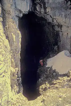 The first recorded entrance sighting was in 1985 by cavers in a helicopter supporting a nearby expedition. The following year the cave was explored to a frozen mud and stone blockage at the base of the second pitch at a depth of 263 meters. The blockage was removed in 1994 by a team led by Neeld Messler, Jim Hewett and Stephen Alvarez. A final exploration in 2001 by a team led by Canadians John Donovan, Jason Morgan, Dan Pach and Australian Warwick M Green (Formally known as Warwick Baggs) pushed the cave from the blockage and discovered the sump at -472 m. This team surveyed and mapped the cave and published their findings with the assistance of Dr Chas Young of the University of Calgary.