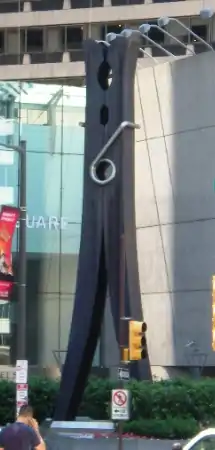 Clothespin is a weathering steel sculpture by Claes Oldenburg, located at Centre Square, 1500 Market Street, Philadelphia.[2] It is designed to appear as a monumental black clothespin. Oldenburg is noted for his attempts to democratize art with large stylized sculptures of everyday objects, and the location of Clothespin, above Philadelphia's City Hall subway station, allows thousands of commuters to view it on a daily basis.[3] It was commissioned in May 1974 by developer Jack Wolgin, as part of the Philadelphia Redevelopment Authority's percent for art program, and was dedicated June 25, 1976.[4][5]