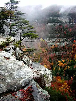The park is located on the Cumberland Plateau, atop Lookout Mountain. On the summit of Lookout Mountain, the waters of Daniel Creek and Bear Creek cut gorges through the rock, converging to form Sitton Gulch Creek.[4] The flat-topped mountains of the Cumberland Plateau are significantly different from the narrow Armuchee ridges beyond nearby Chickamauga Valley to the east. From a geological standpoint, Lookout Mountain is transitional between the flat-lying sedimentary beds of central Tennessee, and the ridges and valley to the east, which display more intensive folding and faulting.[5] Most of the canyon's rock formations consist of sandstone; shale layers below the sandstone are marked by pine trees.[1]
