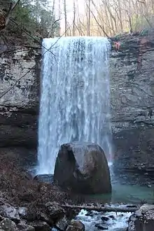 The Waterfalls Trail begins on a paved section, at the main overlook, and progresses into the canyon along a 40-degree slope. Most of the trail consists of gravel, and a 600-step staircase.[7] Each waterfall emanates from Daniel Creek, and both cascade down sheer faces at 60 feet (18 m) and 90 feet (27 m). The trail is generally considered to be a strenuous hike, which can take up to 90 minutes to complete.[8] Cherokee Falls is 0.3 miles (0.48 km) from the trailhead; Hemlock Falls, at the bottom of the canyon, appears at 0.5 miles (0.80 km).[9] Each cascades into small pools at the base of the canyon, and continue down through a boulder-strewn stream bed. The creek flow feeding the waterfalls varies considerably according to the season. The Sitton's Gulch trail, commencing at the bottom of the Waterfalls Trail, runs parallel to the creek until it ends in a parking area in Trenton.