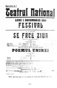The Romanian National Theatre was officially opened on 18 September 1919, simultaneously with the Romanian Opera and the Gheorghe Dima National Music Academy. The inauguration performance, Poemul Unirei (English: The Unification Poem) by Zaharia Bârsan, took place on 1 December 1919.