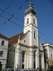 Built in a late Baroque style between 1792 and 1796, according to the plans of Anton (Antal) Türk, the apse is semicircular and the vestibule faces south. A two-story spire with an onion-shaped roof dominates the facade. The upper parts of the facade are somber compared to the lower, which features tall niches between the pilasters. The central niche contains the portal, topped by an ellipse-shaped window, a small and amply sculpted balcony and another window in the shape of an arch segment. The pilasters have Doric and Ionic capitals, while the Neoclassical stucco decor includes sculpted shells, garlands and grape bunches.[1] The church is listed as a historic monument by Romania's Ministry of Culture and Religious Affairs.[2]