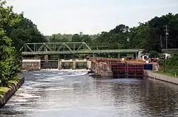![]() The Clyde River begins at Erie Canal Lock #27 in Lyons, New York. This view is looking upstream towards the lock. | |