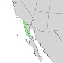 This species is distributed within the states of California in the United States and Baja California in Mexico. In California, this species occurs on the southern coast in San Diego and Orange counties, and on San Clemente Island.[6] In Baja California, this species is found throughout the northwestern portion of the state south to the Central Desert.[24] It also has a disjunct distribution in the Sierra de San Borja near Bahia de Los Angeles in southern Baja California.[25][24]