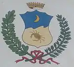 | Shield bearing two intertwined branches of oak and olive tree and crest, surmounted by a crown, depicting at the top a half waning moon and a crab at the bottom. |