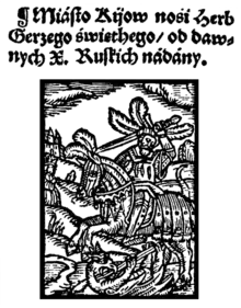The coat of arms traces its history back to the medieval principality of Kievan Rus', where the Archangel Michael was depicted on the seals used by the Kievan grand princes. Initially the coat of arms of Kyiv featured Saint George fighting a dragon on an azure field, and this today remains the coat of arms of the Kyiv Oblast. In the 16th century, a coat consisting of the Archangel Michael clad in white robes, holding a sword and a shield on a red field was adopted for the Kyiv Voivodeship.