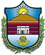 | Blazon | Per fess azure, a fess barry of six gules and azure, a pantheon proper, on chief, a snow topped mountain proper and river vert, a sun in his glory issuant from behind Or; on base, a Tayrona pendant Or proper. |