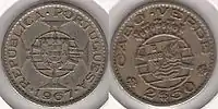 (On the left) Portuguese coat of arms over the cross of the Order of Christ in the Cape Verde 2.5 escudos coin of 1967