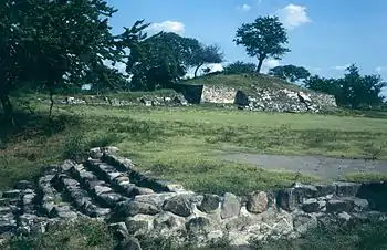 The ballgame court is relatively small for the game. Excavations under the main stairway of the platform found elite burials with hundreds of funeral offerings, including ceramic vessels, obsidian, jade, and copper-bronze artifacts. They also found a group of basaltic utensils for grinding corn on a metate, carefully arranged to the side of the ballgame court and visible today.[3]