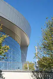 The asymmetrical top of the building rises above the multi-story glass facade that allows views of the grand alabaster staircase and lobbies beyond when lit at night.[6] The rising waves were meant to soften the transition to the fly tower required over the stage.[5] Just inside the entrance, visitors are greeted by the commissioned mural The Nine Muses by Jimmy O'Neal.[6] The chandeliers in the main lobby[5] and those in the ballroom are the Nastro designed by Tobia Scarpa and made by Andromedamurano.[6] The interior throughout the Centre makes extensive use of traditional theater colors such red and gold as well as dark wood finishes. The Cobb Energy Performing Arts Centre was completed within schedule and budget.[6]