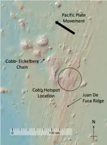The Cobb hotspot is a marine volcanic hotspot at (46˚ N, 130˚ W),[1] which is 460 km (290 mi) west of Oregon and Washington, North America, in the Pacific Ocean. Over geologic time, the Earth's surface has migrated with respect to the hotspot through plate tectonics, creating the Cobb-Eicklberg seamount chain. The hotspot is currently collocated with the Juan de Fuca Ridge.