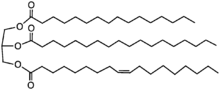 Cocoa butter contains a high proportion of saturated fats as well as monounsaturated oleic acid, which typically occurs in each triglyceride. The predominant triglycerides are POS, SOS, POP, where P = palmitic, O = oleic, and S = stearic acid residues.[6][7][8][9] Cocoa butter, unlike non-fat cocoa solids, contains only traces of caffeine and theobromine.[10]