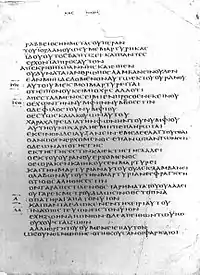 The first three lines of each book are in red letters, and black and red ink alternate the title of books. As many as eleven people (G, A, C, B, D, E, H, F, J1, L, K) have corrected the manuscript between the sixth and twelfth centuries.[3] The text is written colometrically and is full of hiatus. The Greek text of the codex has some copying errors, e.g., errors of metathesis: in John 1:3, ΕΓΕΝΕΤΟ (egeneto) was changed into ΕΝΕΓΕΤΟ (enegeto); in Acts 1:9, ΥΠΕΛΑΒΕΝ (hypelaben) into ΥΠΕΒΑΛΕΝ (hypebalen).