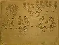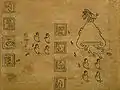 The codex depicts the events of the Mexica migration from Aztlán and their history from the years 1168 to 1355 AD.[3] It begins with a priest leading Chimalma, fabled ancestor of the Azteca, from Aztlán via a boat.[18] Once they arrive at the shore, near Colhuacan, they build a sheltered altar for their god, Huitzilopochtli, who ordered this migration.[19] There they also encounter eight tribes that desire to accompany the Azteca.[20][lower-alpha 4] The Azteca agree and the nine tribes set out under the leadership of the four god-bearers, Chimalma, Apanecatl, Cuauhcoatl, and Tezcacoatl, each carrying a tlaquimilolli.[21]