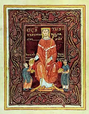 The Codex Egberti is a gospel book illuminated in the scriptorium of the Reichenau Monastery for Egbert, bishop of Trier (980–993). It is now held in the city library of Trier (Cod.24).