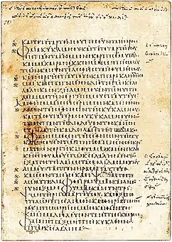 Codex Marchalianus designated by siglum Q is a 6th-century Greek manuscript copy of the Greek version of the Hebrew Bible (Tanakh or Old Testament) known as the Septuagint. The text was written on vellum in uncial letters. Palaeographically it has been assigned to the 6th century.[1] Marginal annotations were later added to the copy of the Scripture text, the early ones being of importance for a study of the history of the Septuagint.